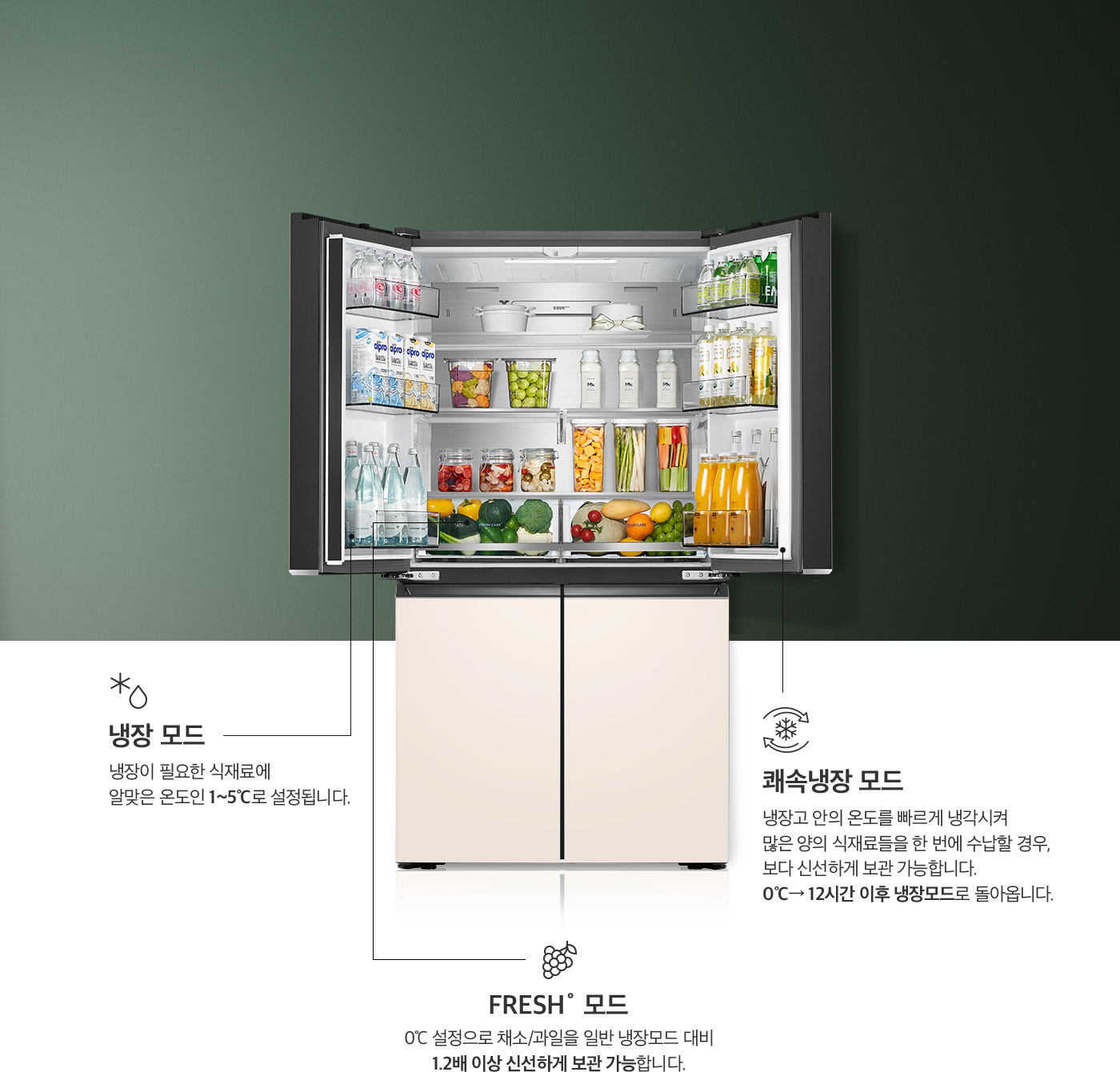 - 0℃ 설정으로 채소/과일을 일반 냉장모드 대비 1.2배 이상 신선하게 보관 가능합니다.