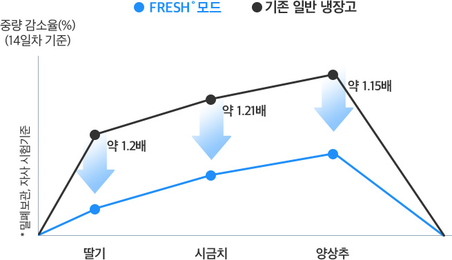 * 세척 후 용기에 넣어 FRESH˚와 자사 일반 냉장고 냉장모드로 보관 7일 후 측정한 수치임