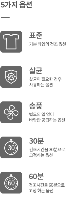 5가지 맞춤 옵션으로 상황에 따라 조정하여 건조하세요.